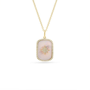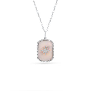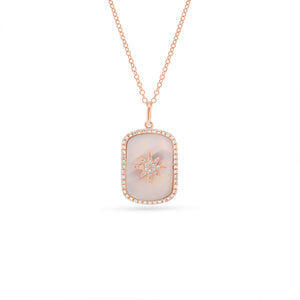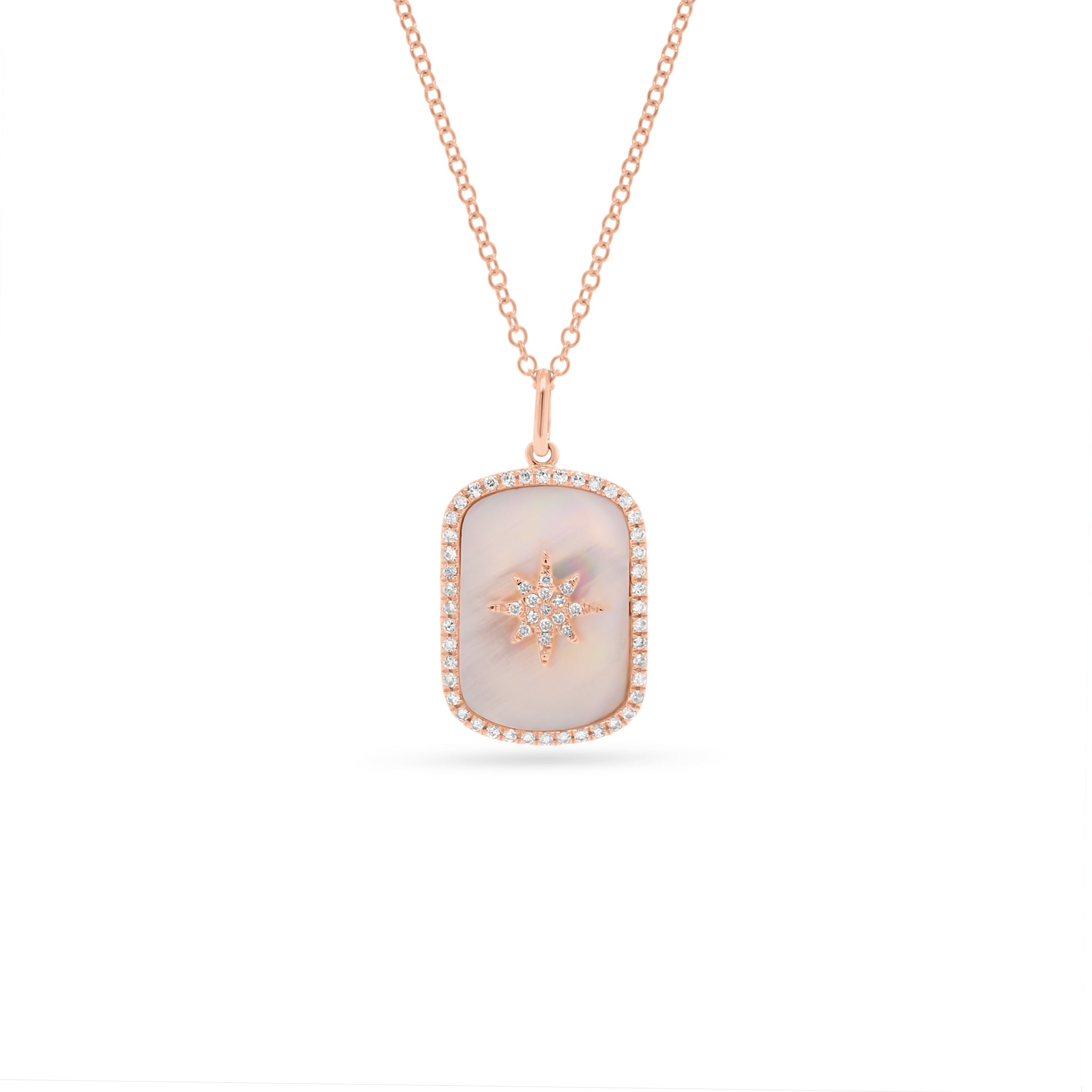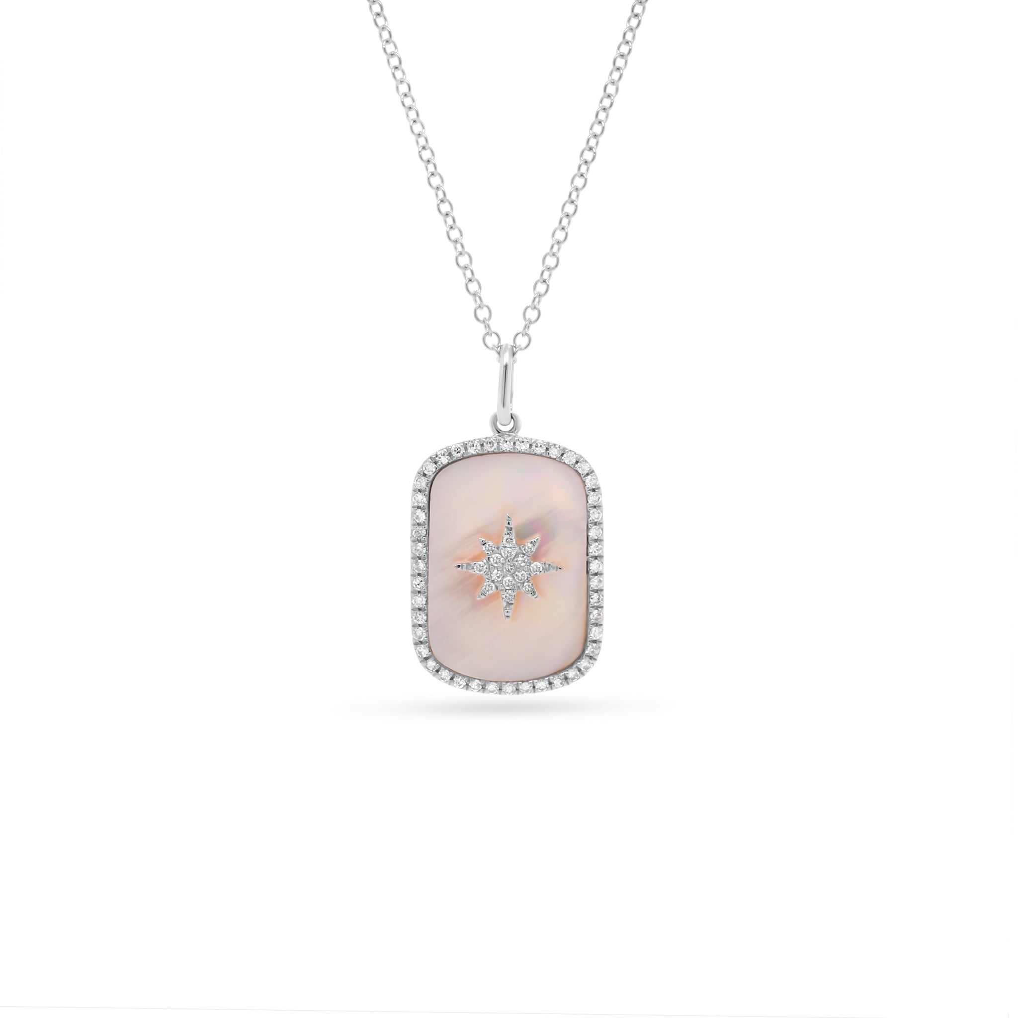 An elegant take on the classic dog tag necklace, this style features a slice of luminous mother of pearl topped with a diamond-encrusted starburst and surrounded by a frame of sparkling diamonds.