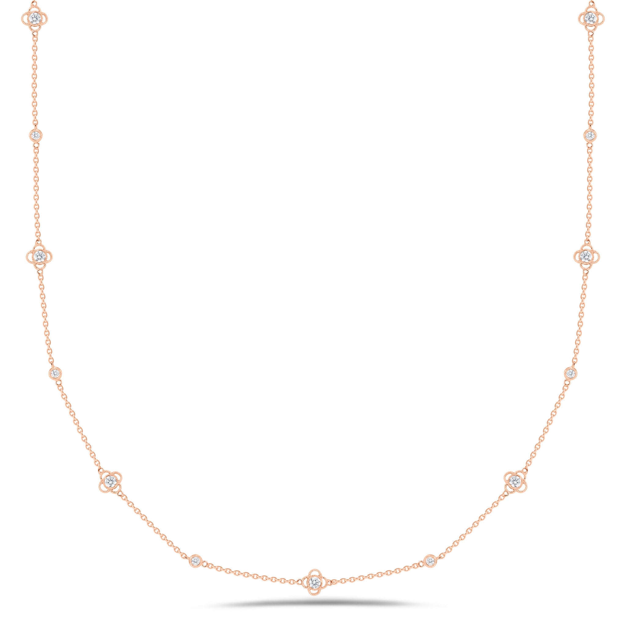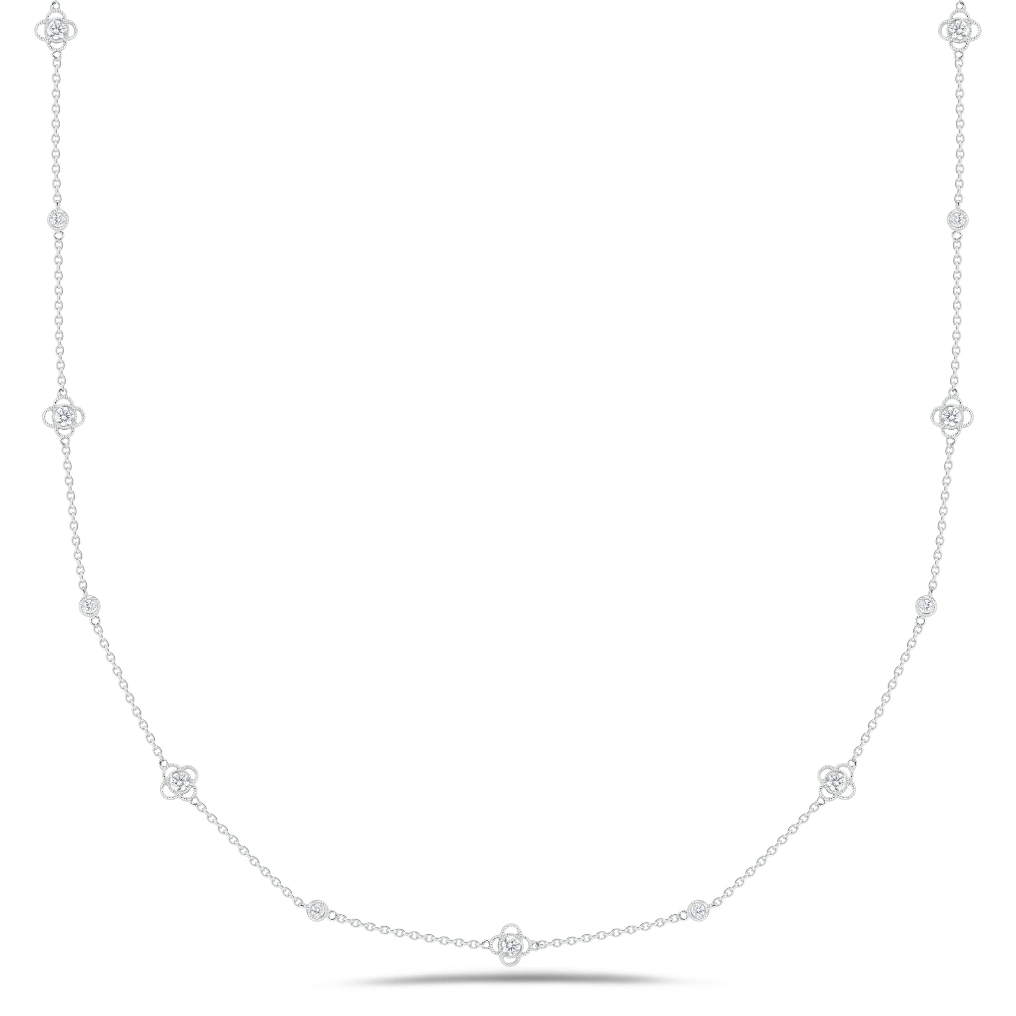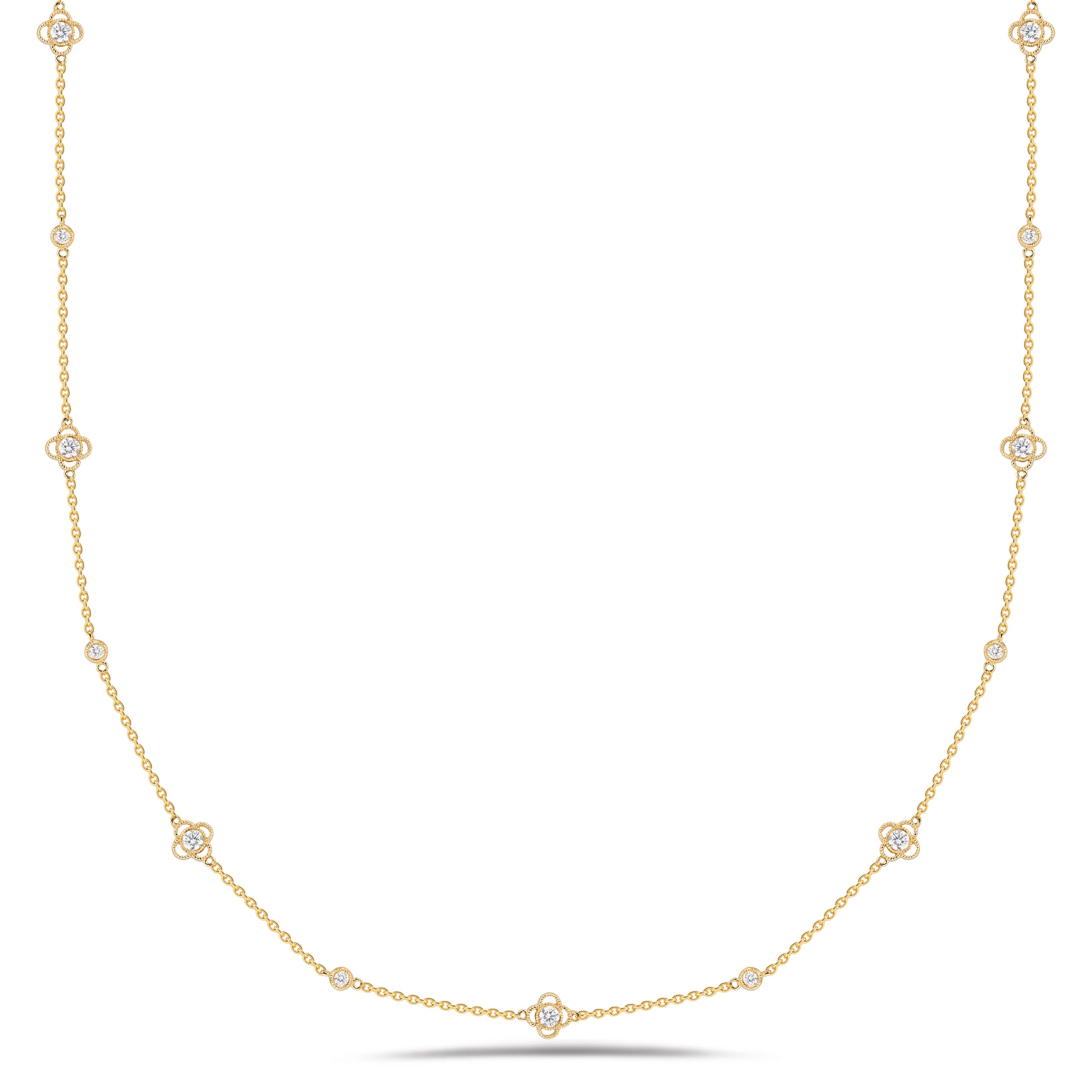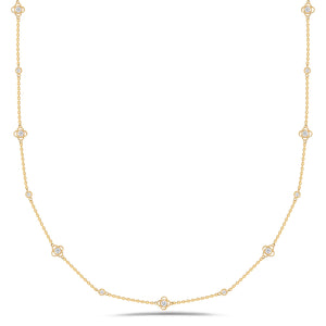 This delicate cable chain necklace features 15 sparkling round diamonds within 18K gold bezels. An open trefoil setting around every other diamond sets this piece apart from the traditional Diamonds by the Yard style.