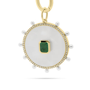 A vibrant emerald and luminous slice of mother of pearl make this charm a standout piece. A frame of glittering diamonds and lustrous pearls enhances its shine and completes the intricate composition.