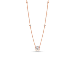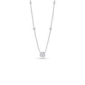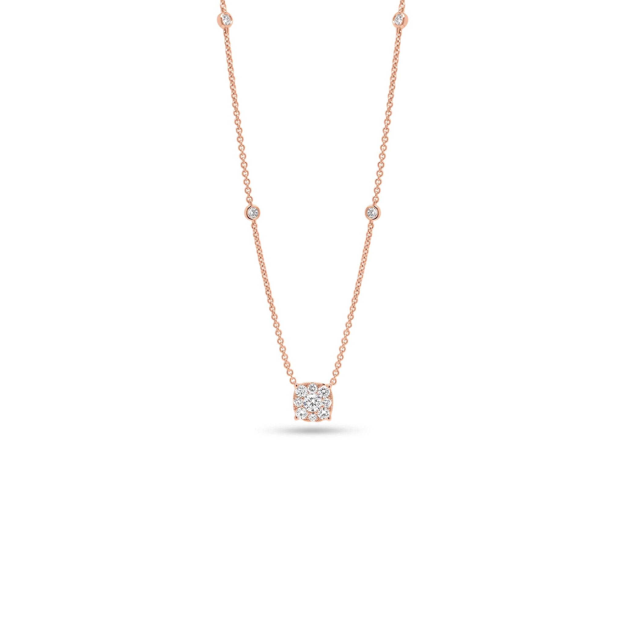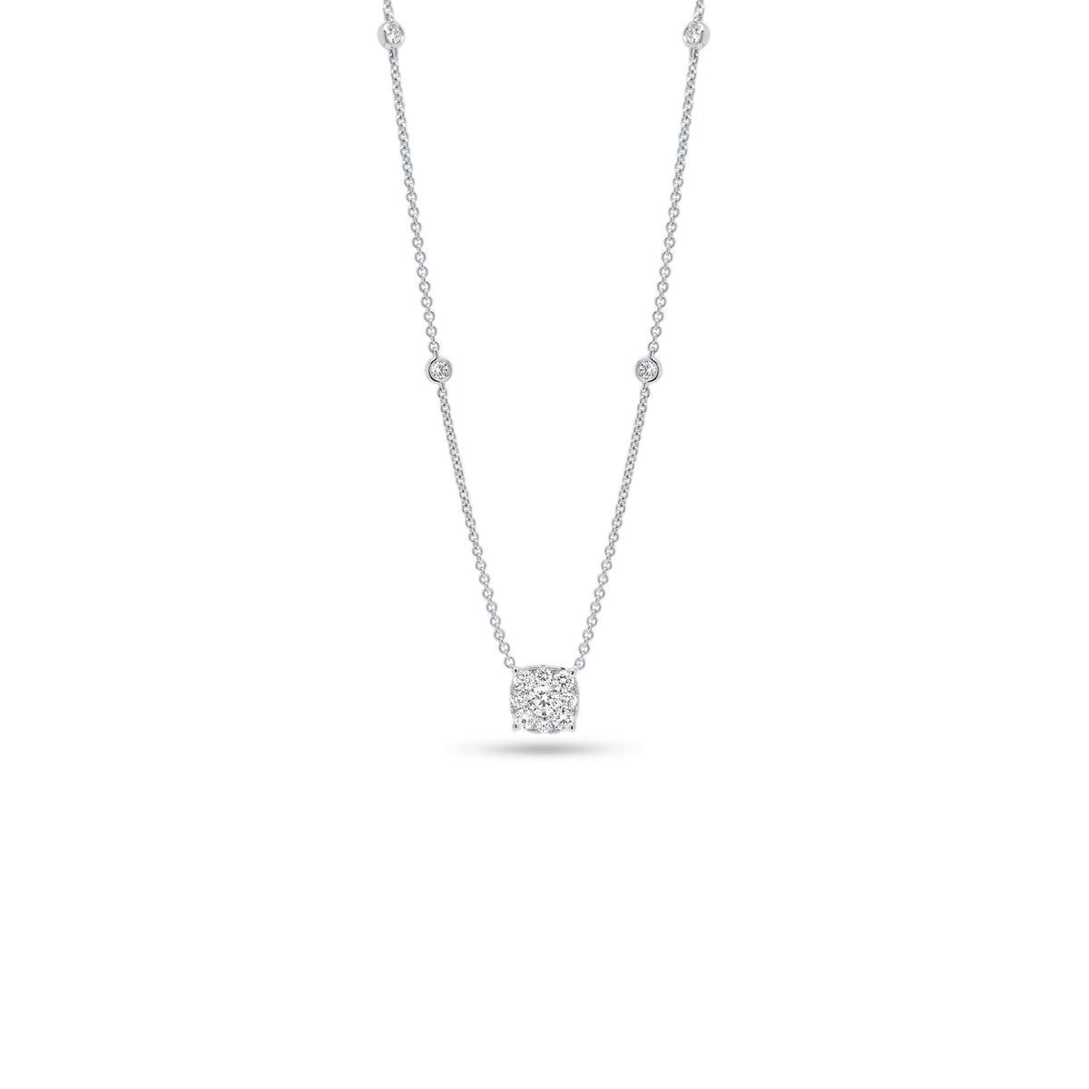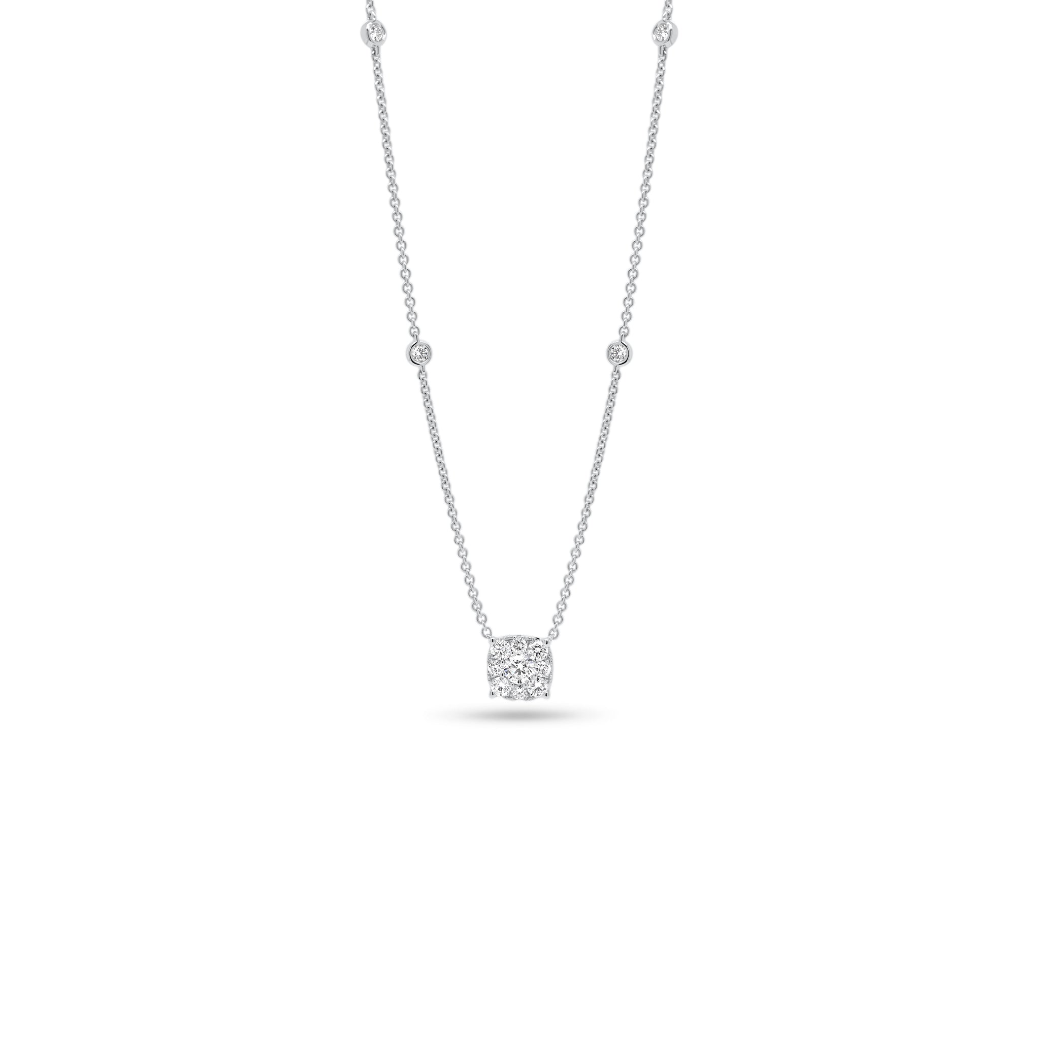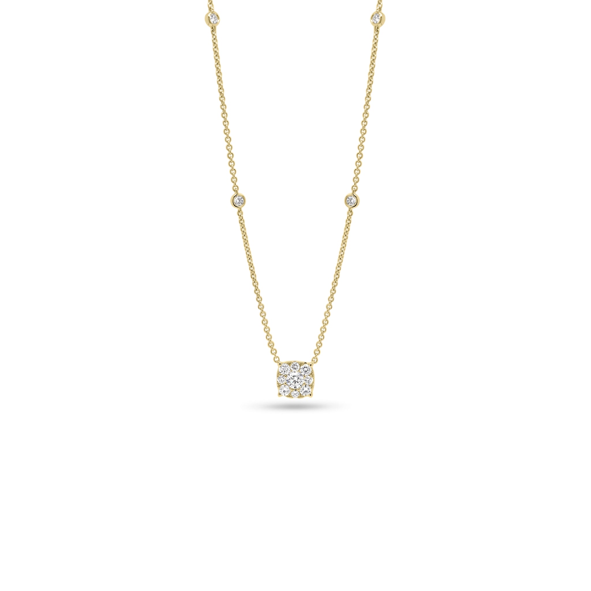 This gorgeous necklace features multiple round brilliant-cut diamonds within a cushion-shaped pendant. Multiple bezel-set diamond stations set along its 18K gold chain offer enhanced sparkle.