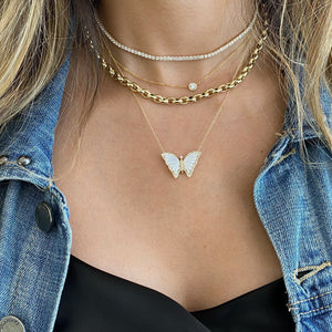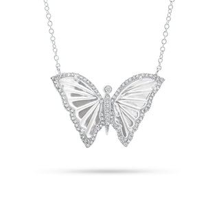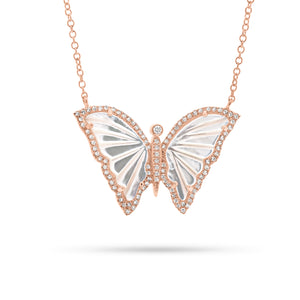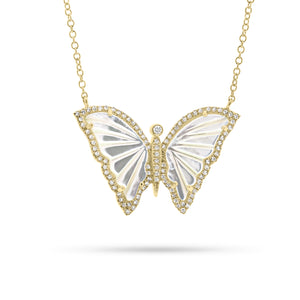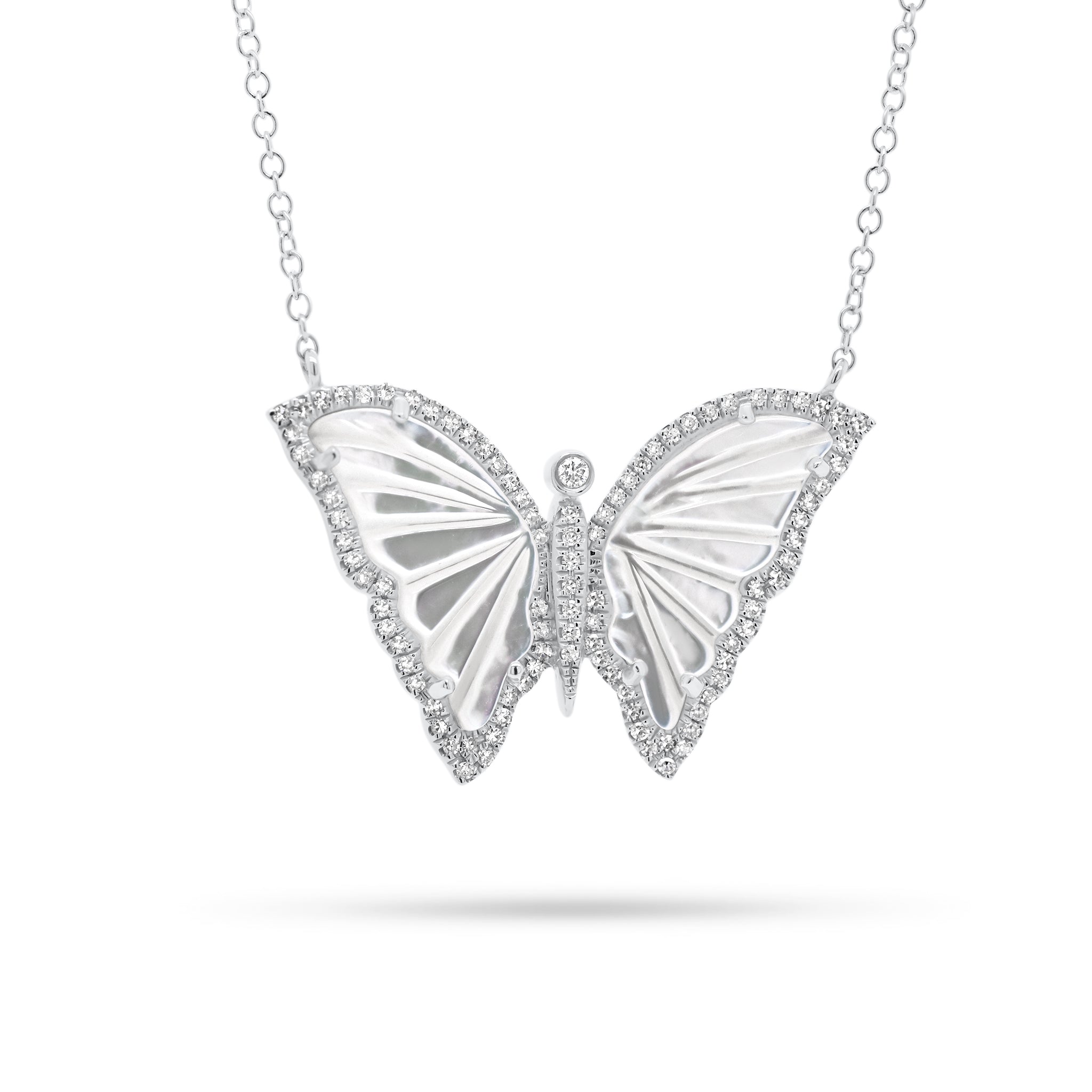 Bring the energy of this whimsical creature to your looks with this gorgeous butterfly pendant. Featuring two carved slices of mother of pearl surrounded by diamonds set in 14K gold, this peace is a standout beauty.