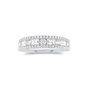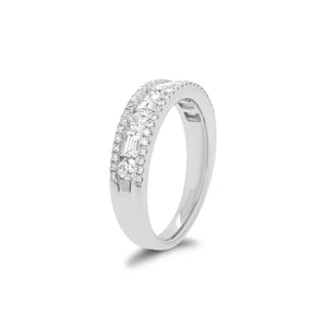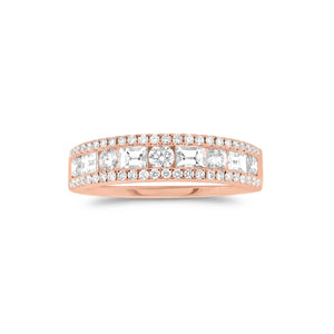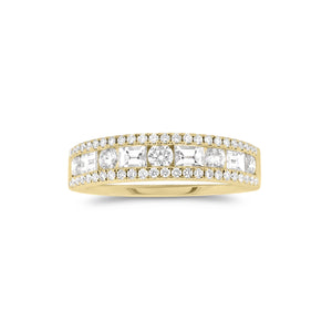 For the gal who never shies away from sparkle — this stunning wedding band features slim baguettes and round brilliant-cut diamonds intricately set in 18K gold. Whether worn by itself or with your engagement ring, this piece delivers serious shimmer.