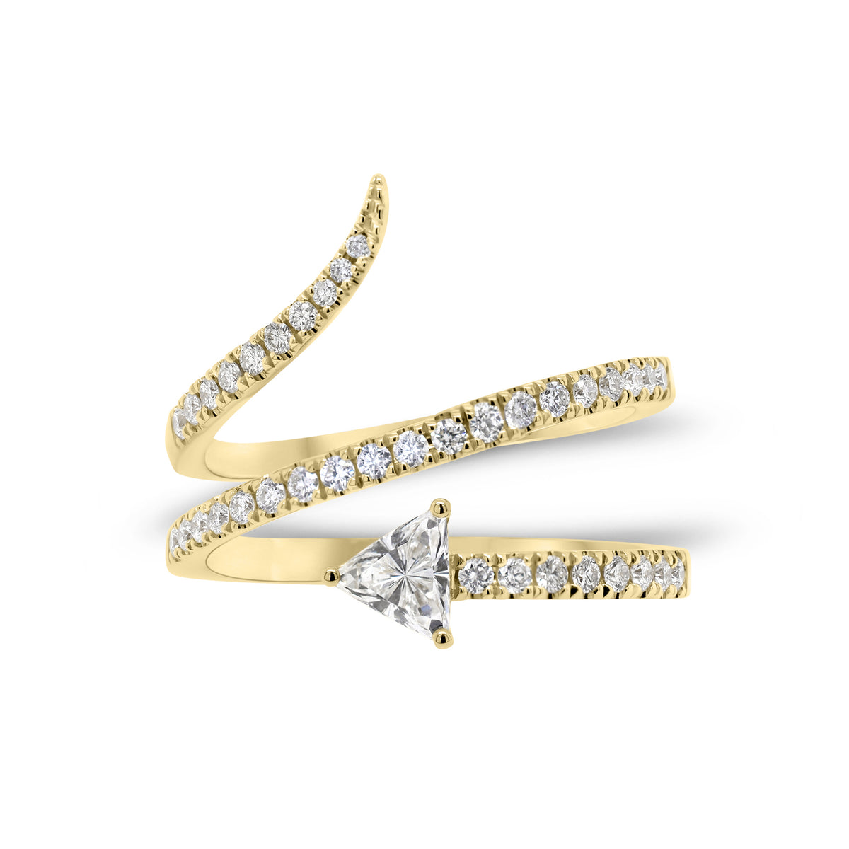 Wrap your finger in glittering elegance. This stunning wraparound-style ring features a striking trillion-cut diamond and numerous round diamonds.