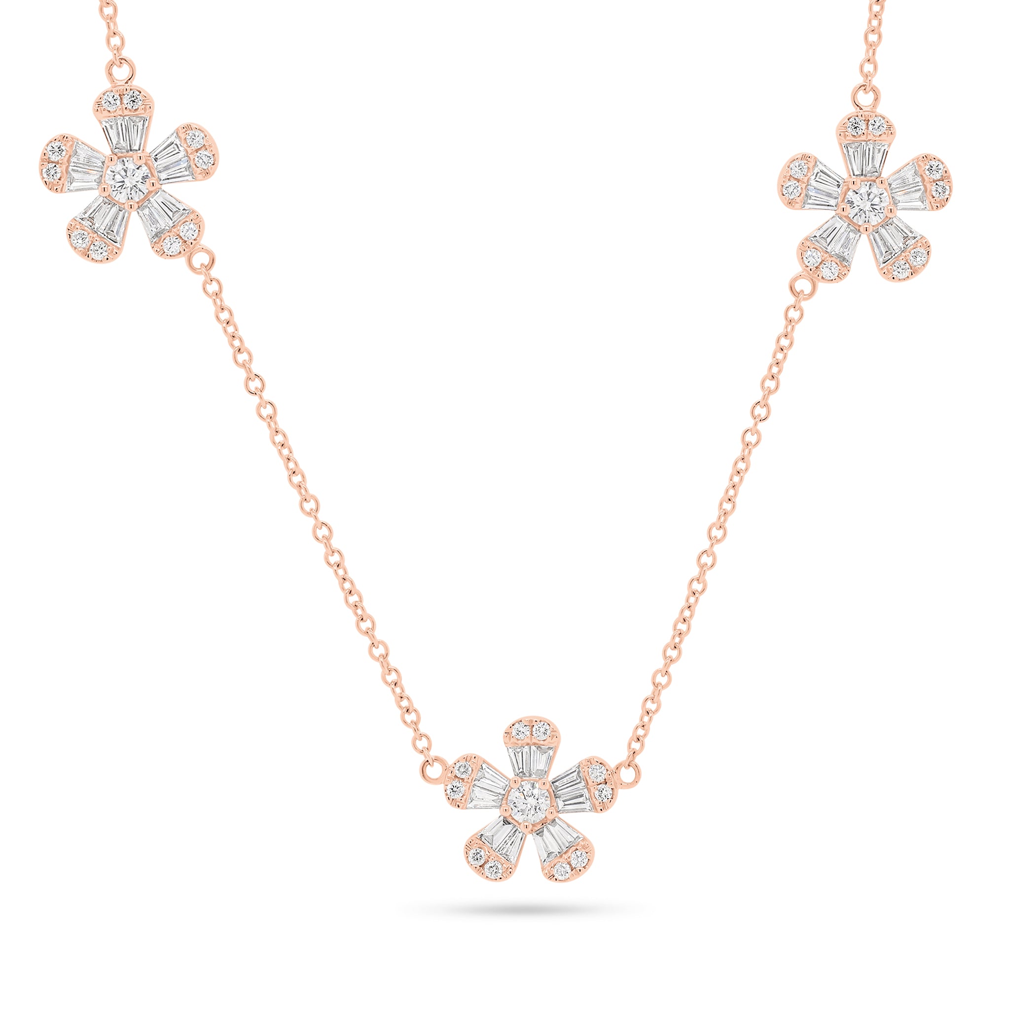 Nurture your blooming style with our Round & Baguette Diamond Flower Station Necklace. The 14K gold chain features three blossoms set with round and baguette diamonds, instantly adding a nostalgic charm to any outfit. Pair it with other necklaces, or wear it alone for a spotlight-stealing accessory.